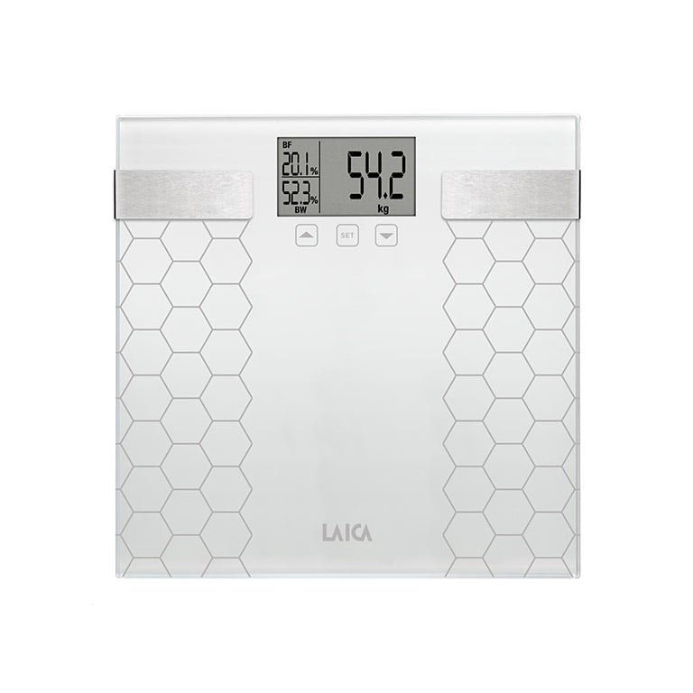 - Mide el peso, calcula el% de masa grasa, el% de agua, el% de músculos esqueléticos, el metabolismo basal y el índice de masa corporal.