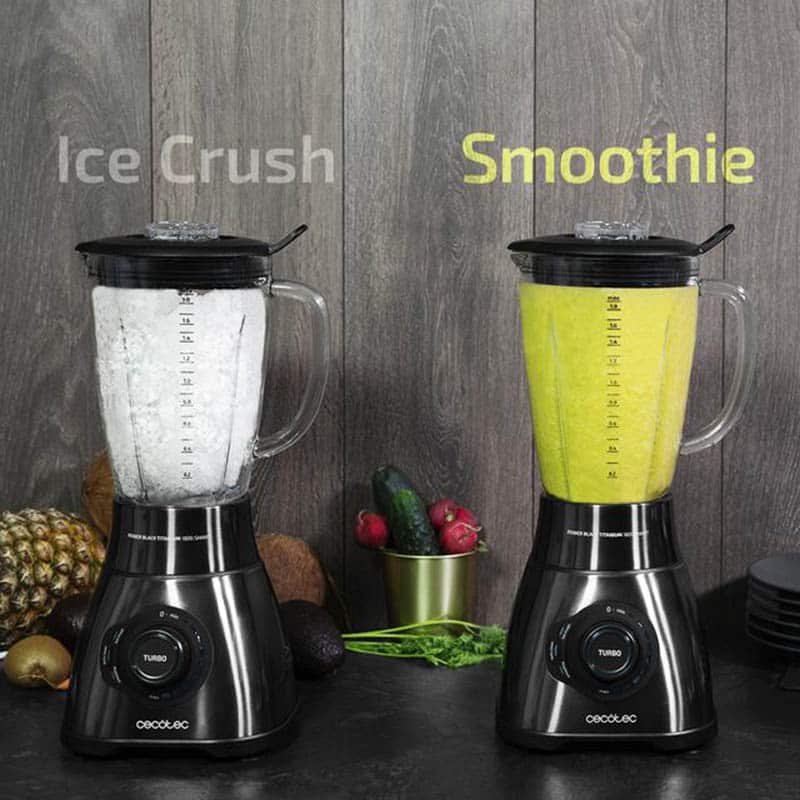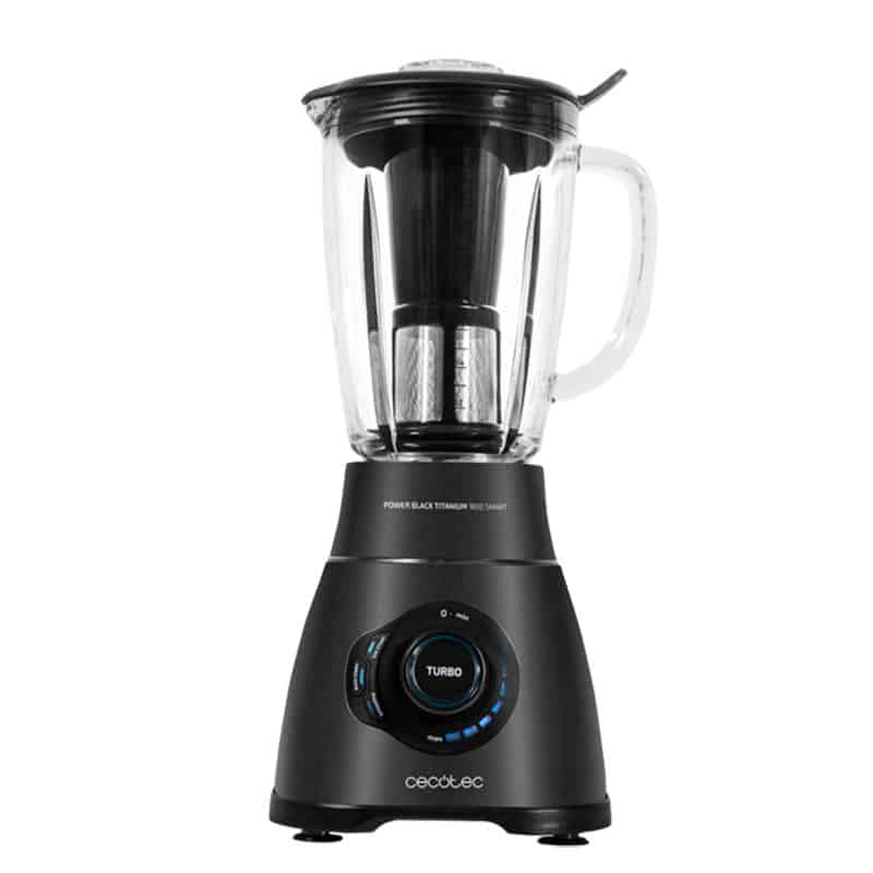- Cecotec Batidora de vaso americano digital Power Black Titanium 2500MAX Smart de 1800 W de Potencia, con Cuchilla de 6 Hojas de Titanio negro, Filtro para licuados, 3 Programas Automáticos y Jarra Termorresistente.