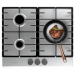 Bolero Squad G 3200F Inox Placa de gas, 3 fuegos, acabado en acero inoxidable, parrillas completas de hierro fundido, potencia de 6,25kW, quemador WOK triple corona, encendido eléctrico, sistema de seguridad de las válvulas, para gas natural y accesorio para la conversión de gas incluído.