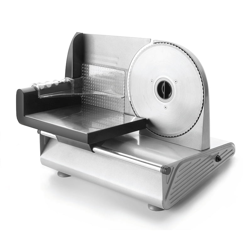 - El cuerpo de la cortadora eléctrica HOME está fabricada en metal y la bandeja en inoxidable (es abatible). Cuenta con una pantalla protectora y cabezal ajustable de suave deslizamiento, y transmisión por engranaje. El espesor de corte es también ajustable desde 0 a 15 mm.
