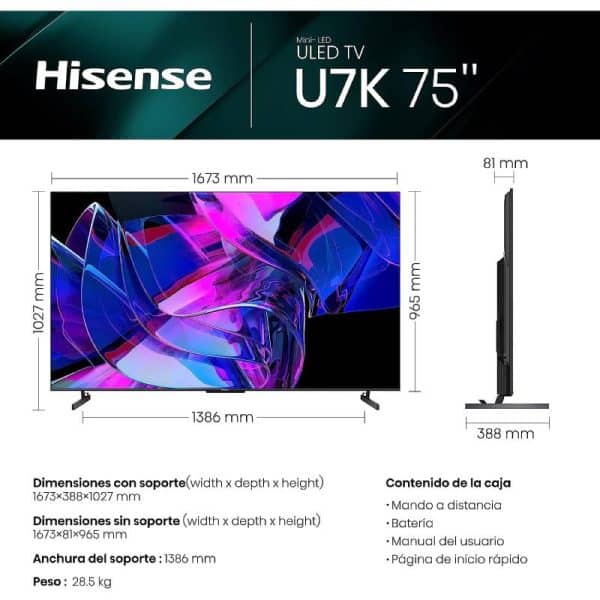 NOMBRE DEL PRODUCTO Marca HISENSE Modelo75U7KQ EAN6942147493540 Exhibición Pulgadas 75″ Relación de aspecto nativa 16:9 Resolución 4K Ultra HD Retroiluminación