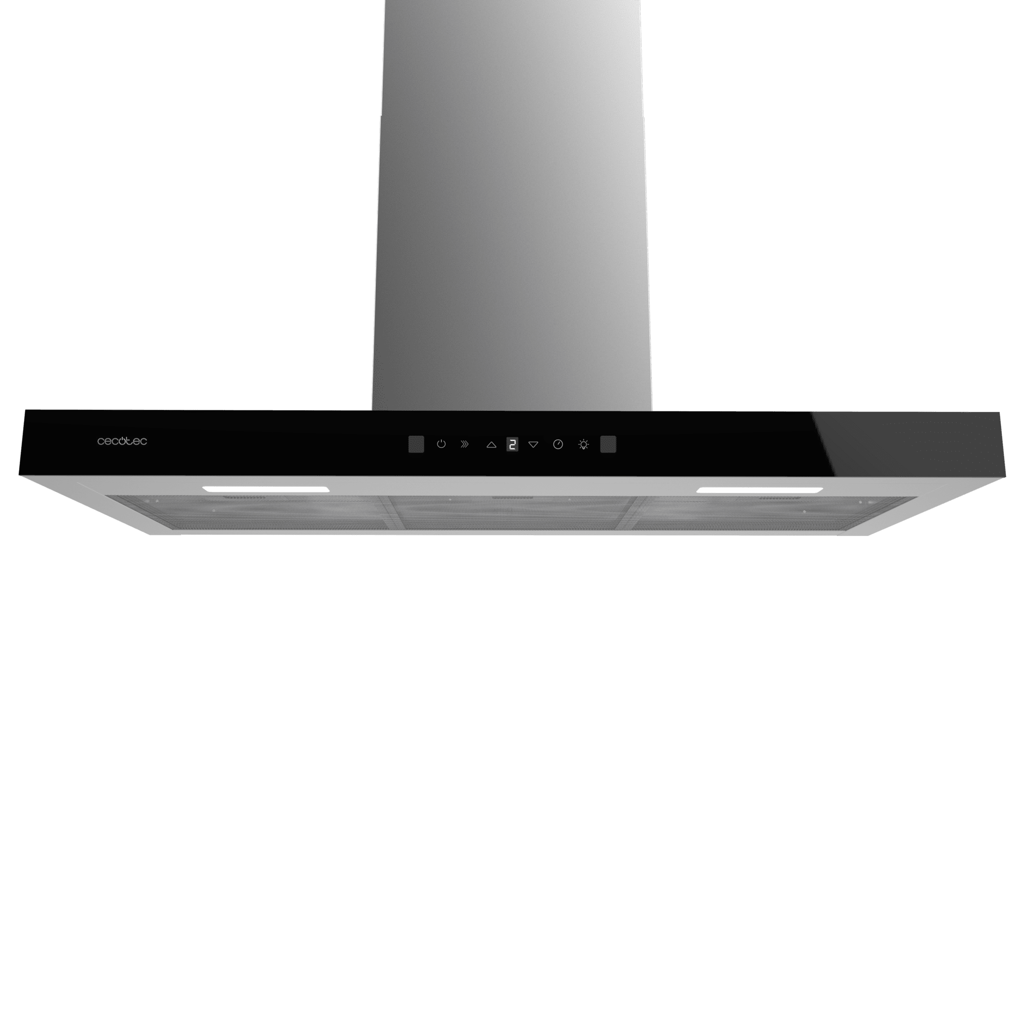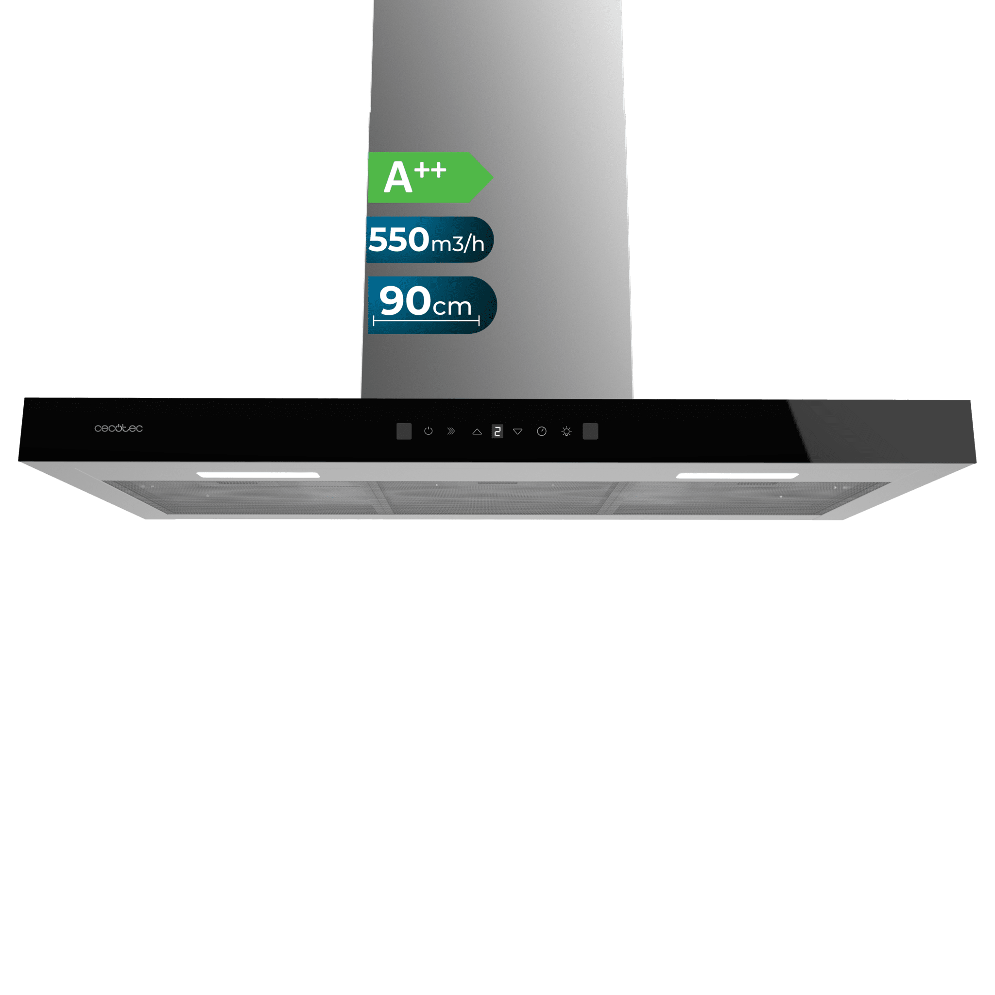 Flux TT 905500 Glass Black A++ Campana T de 90cm de ancho, acabado frontal cristal negro, succión 550m3/h, Motor 70W, Clase A++, control táctil, 3 niveles de potencia, luz, filtro de carbono, Hand Movement Control y Delay Function.