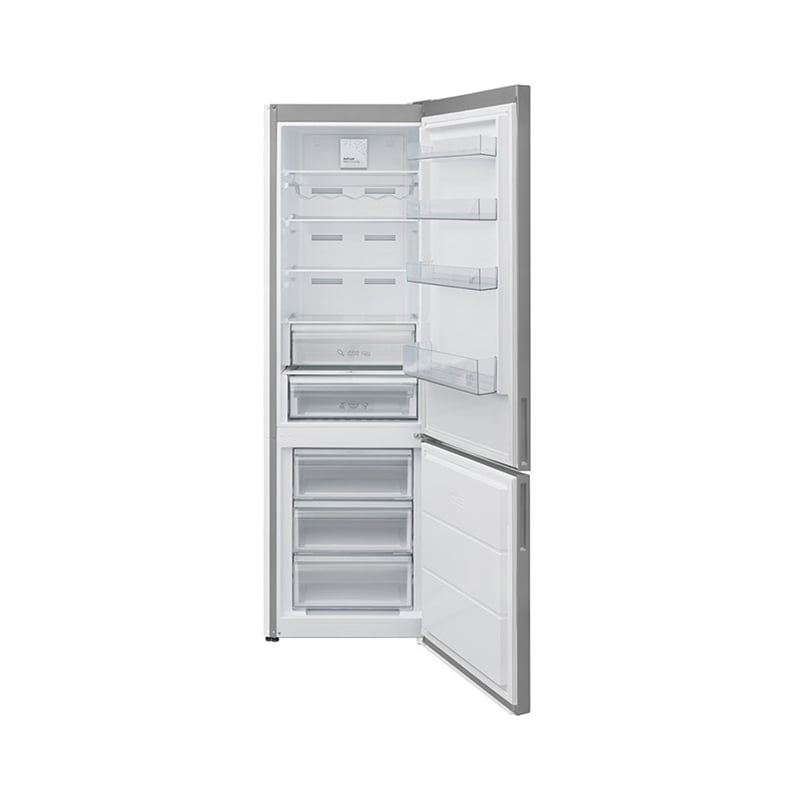 Frigorífico combinado de 201 cm en color inox look. Control electrónico con pantalla interior de control independiente del congelador y el refrigerador denominada Display Dual Control. Dispone de un cajón especial para frutas y verduras y uno adicional para carnes o pescados. Cuatro estantes de seguridad, tres balcones y un balcón botellero. Gracias a su gran tamaño, permite incluir un estante especial para botellas. El congelador tiene tres cajones transparentes e incluye cubitera. Puertas reversibles.