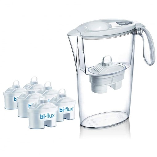 - Características especiales – Juego de 6 filtros Bi-Flux con jarra de filtración. Capacidad: 2.3 L (1.2 L filtrado). Características de la jarra : tapa con dispositivo Flow “n” go: permite un llenado rápido directamente bajo el grifo de casa. El indicador electrónico recuerda cuándo es el momento de cambiar el cartucho. Apto para lavavajillas (excepto tapa). Se puede guardar en la nevera.