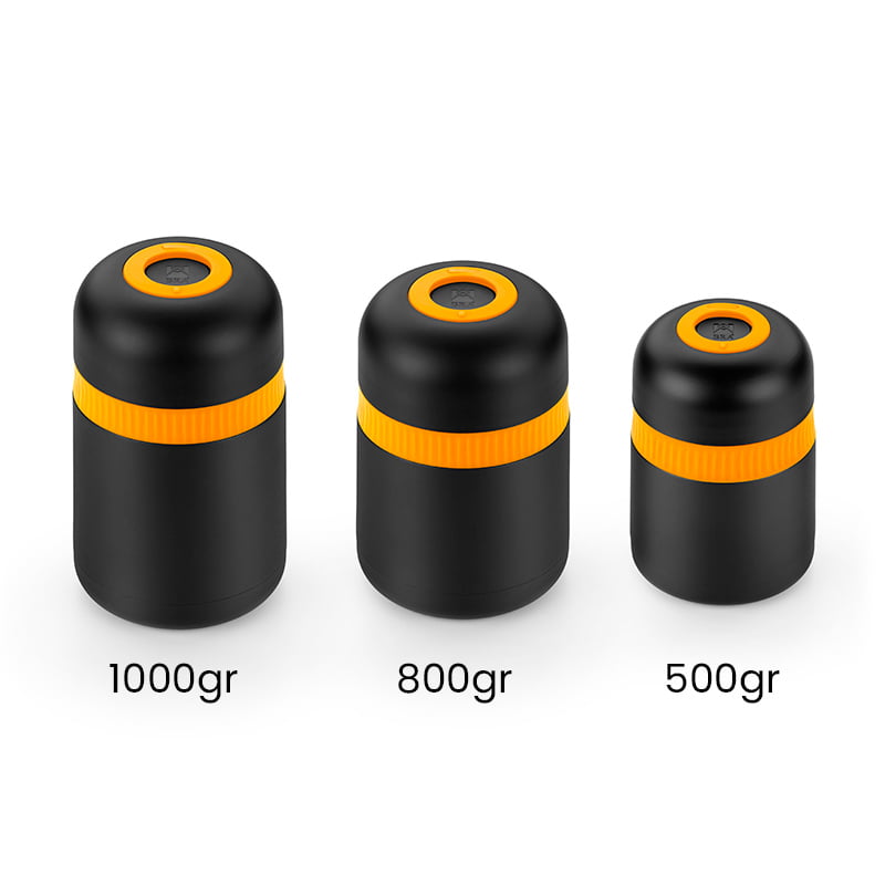 - Accesorios Adicionales: Los modelos de 800 g y 1000 g incluyen una cuchara plegable y dos contenedores adicionales para alimentos secos o cocinados. Estos recipientes están diseñados para llevar junto con el termo y no son aptos para depositar alimentos en su interior.