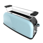 Toastin’ time 850 Blue Long Tostador vertical de acero con una ranura larga, 850 W de potencia y soporte para panecillos.