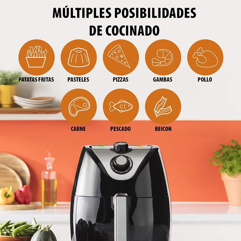 - Prepara todo tipo de platos; Podrás preparar en poco tiempo y fácilmente patatas fritas, platos de carne o pescado, verduras, tostar panecillos, magdalenas, pasteles o empanadillas.