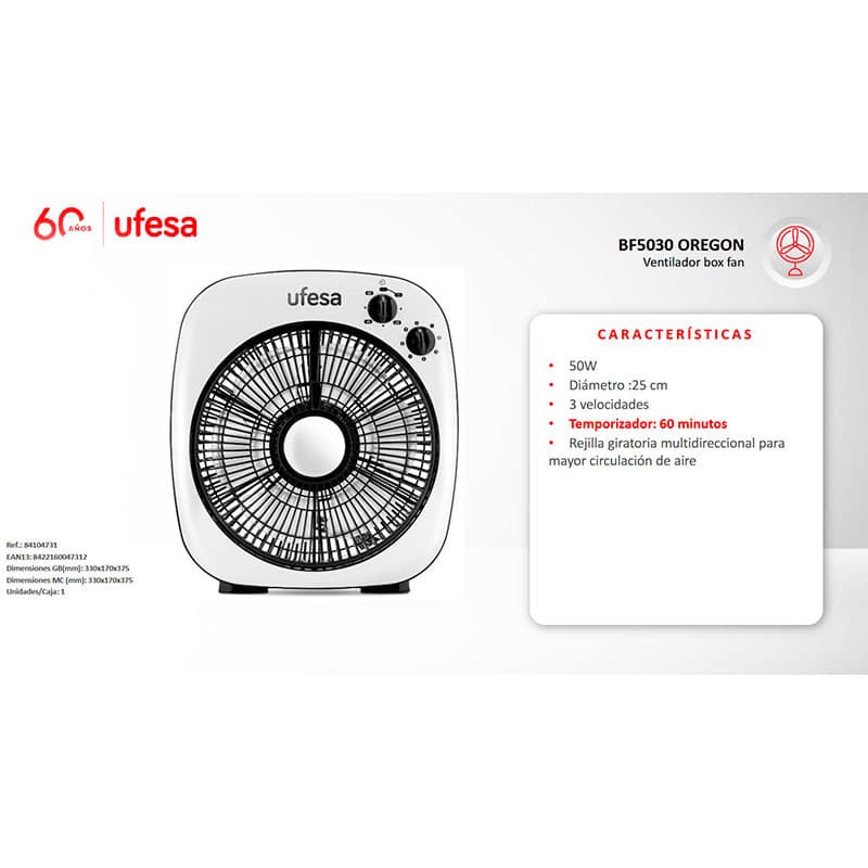 Ventilador Box Fan Ufesa Bf-5030 25Cm 50W 5 Aspas Temporizador