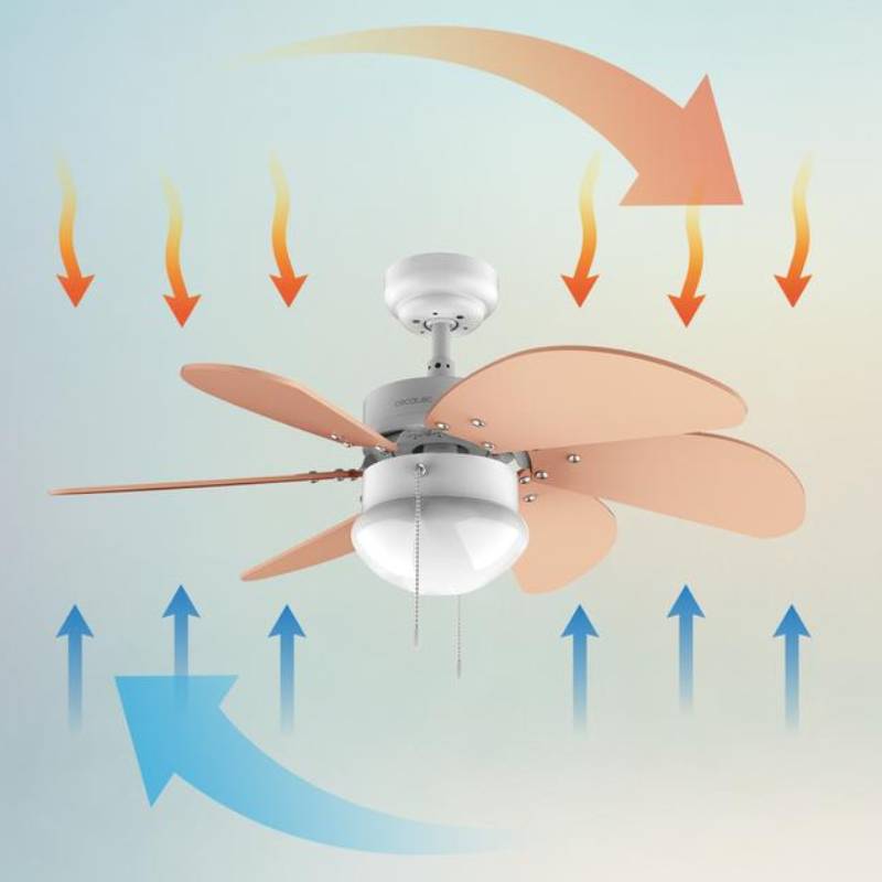 - El ventilador dispone de un sistema de inversión de giro del motor para realizar la función Verano/Invierno. Mediante un conmutador se selecciona el sentido de rotación de las aspas, en un sentido en verano para generar una agradable brisa y en sentido contrario en invierno para impulsar el aire caliente concentrado en el techo hacia el suelo, perfecto para complementar tu sistema de calefacción.