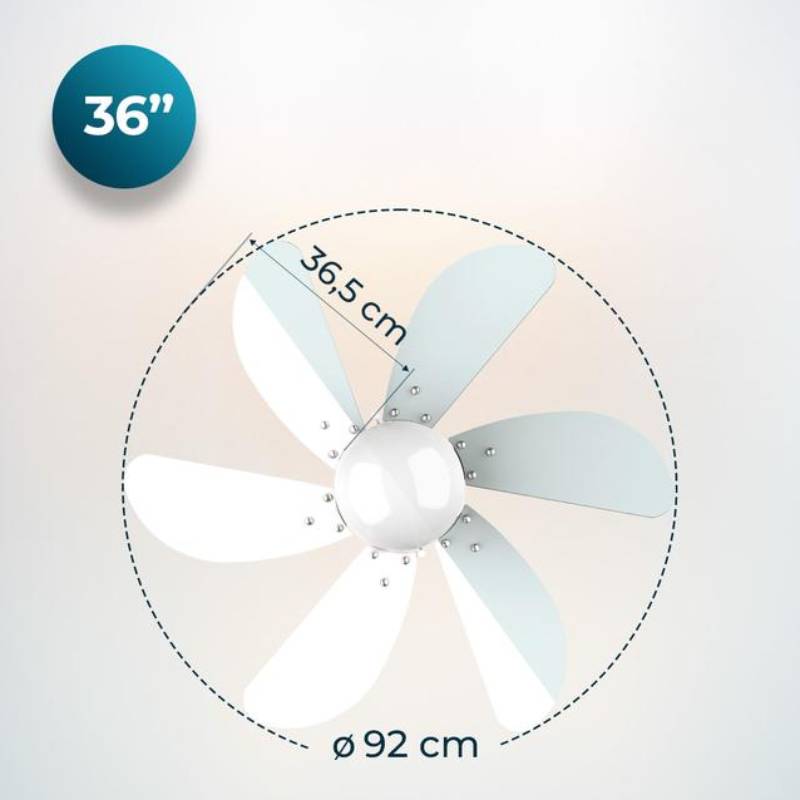 - Amplío diámetro de 36 pulgadas (92 cm) que aumenta la cobertura de aire fresco en la estancia.