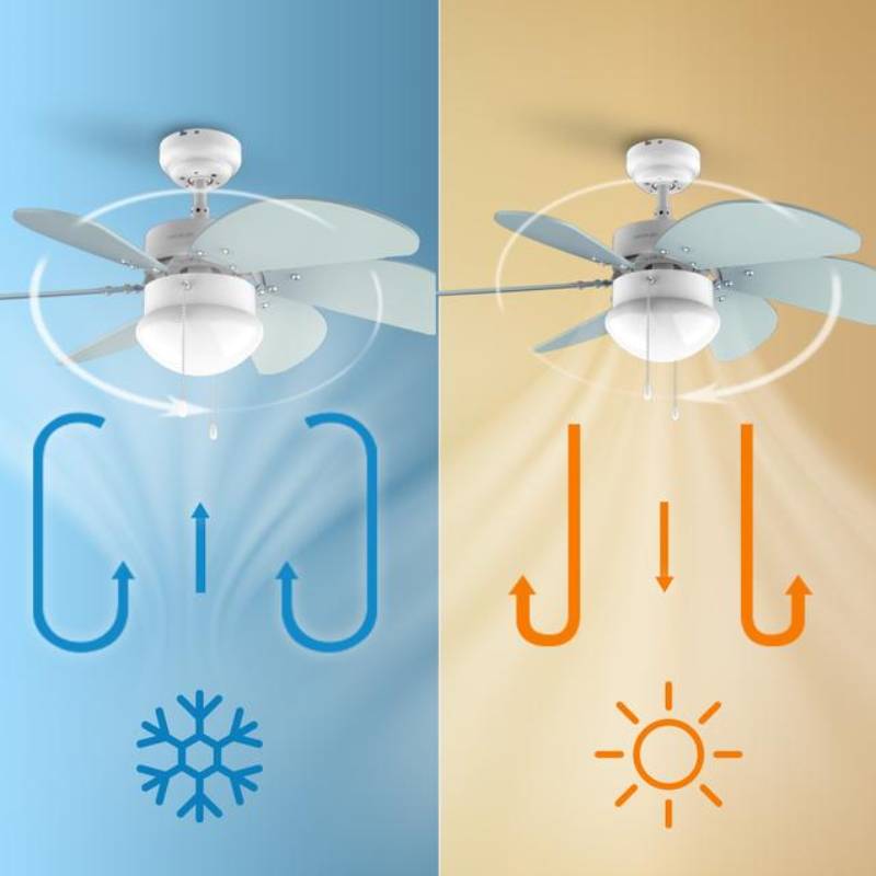 - El ventilador dispone de un sistema de inversión de giro del motor para realizar la función Verano/Invierno. Mediante un conmutador se selecciona el sentido de rotación de las aspas, en un sentido en verano para generar una agradable brisa y en sentido contrario en invierno para impulsar el aire caliente concentrado en el techo hacia el suelo, perfecto para complementar tu sistema de calefacción.